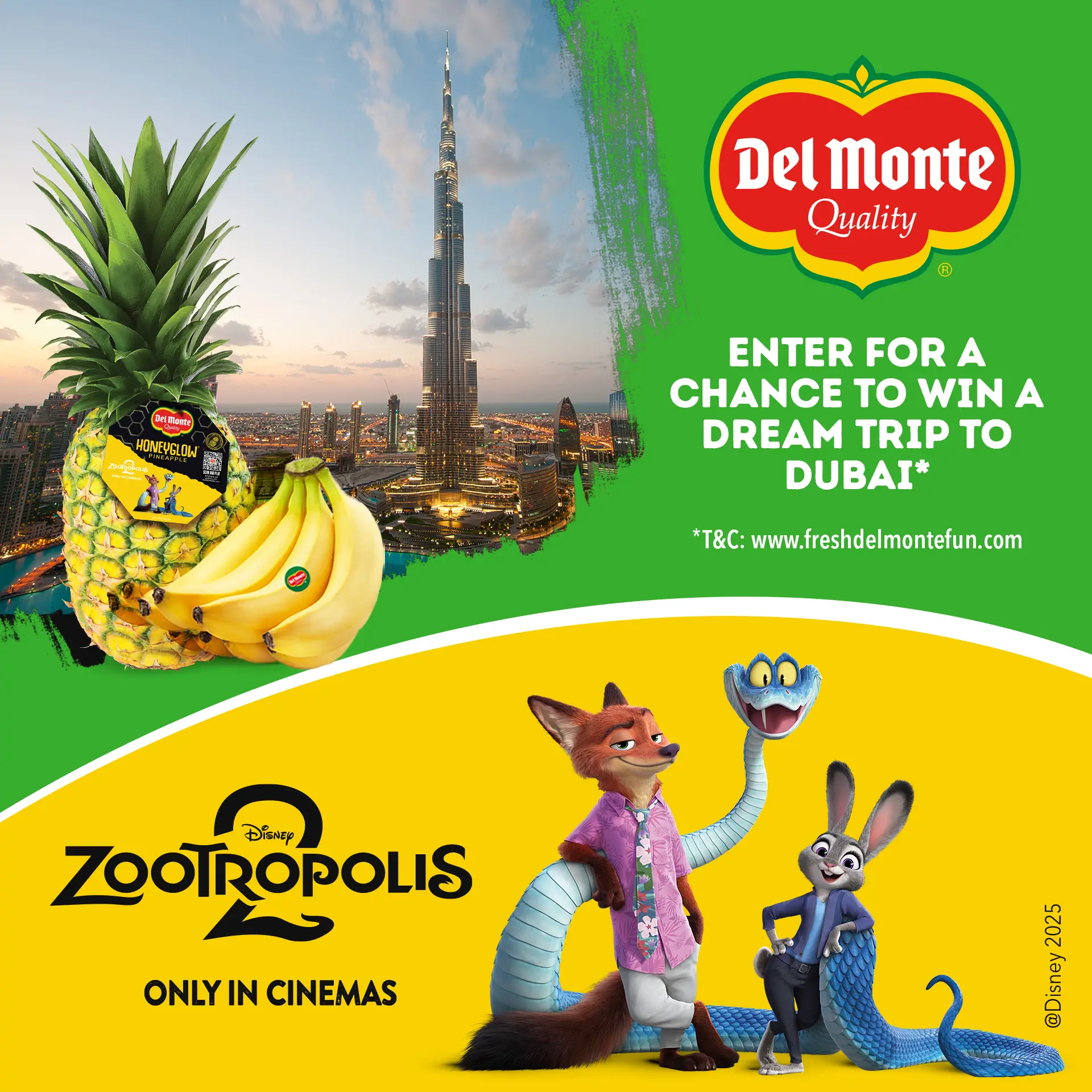 CORAL GABLES, Fla. (October 1, 2025)—Fresh Del Monte Produce Inc. (NYSE: FDP), a global leader in fresh and fresh-cut fruit and vegetables, is teaming up with Disney’s “Zootopia 2” to launch a 360-degree campaign celebrating the release of the film, which comes out November 26, featuring the comeback duo of Judy Hopps (voiced by Ginnifer Goodwin) and Nick Wilde (voiced by Jason Bateman). Fresh Del Monte is bringing the vibrant world of “Zootopia 2” to produce aisles with over 500 million co-branded pineapple tags and banana stickers in stores across all participating regions to encourage healthy habits and family adventure. In addition to in-store activations, the campaign will include interactive, Zootopia-inspired digital promotions, social media content that features fun, family-friendly recipes and a sweepstakes offering families the chance to win a five-night trip to Dubai.
